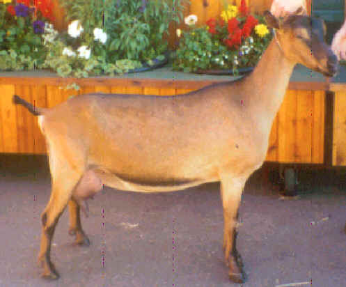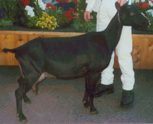 Rhody has excellent general appearance. She is tall, level, and wide throughout. We are very excited about the progress we have seen through the generations. Rhody is a great improvement over her dam. She has a well attached rear udder and a well attached fore that is showing good extension. She has plum teats and is milking well. She also has excellent milk flavor. We are very excited about the improvement that has been made in this line. Rhody first in her class at every show she attended as a yearling and two year old. During 2001 Rhody was 2XGrand Champion and 3X Reserve Grand Champion. She was Grand Champion at the 2001 Western Washington State Fair. During 2002 Rhody was 1X Grand Champion, 1X Reserve Grand Champion and 2X 2nd in 2002. She finished her championship at the second show she attended last year. Rhody is bred to Sodium Oaks Port Salute. She is due to kid March 16, 2003. |