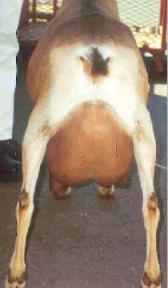 Rasberry has very good general appearance. She is a very level doe throughout. She has been very competitive in her class. She won her first leg as a dry yearling and has been reserve Grand Champion. She was 6th at the 1999 National show. She was a first freshening 2 year old. We are very happy with her mammary. She has a high wide rear udder and a fore udder that is well attached and showing great extension. She has very plum teats. Rasberry earned her second leg during the 2000 show season. During the 2000 show season she was 1X Best of Breed, 1X Best Udder, 1XGrand Champion, 1X Reserve GCH, 7X 1st and 1X 2nd. During 2001 she was 2X1st, 3X 2nd and 1XGrand Champion and 1X Reserve Grand Champion. Rasberry is bred to Lord's Acres Nehemiah. She is due to kid February 25, 2003. |